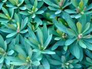 Chanced upon at Notcutts Nursery in England, this gold medal-winning ‘Redwing’ sport premiers plentiful lemon-lime colored flowers accompanied by a dramatic dose of red-imbued new growth and stems, plus elliptical dark burgundy and purple mature leaves. Tailored, well-branched and thickset, the bushy undemanding habit graces containers, mixed borders or rock gardens with velvet-like allure, while abiding deer and shallow rocky soil as well as periodic dry conditions. ‘Blackbird’ retains its evergreen good looks year round in warmer locales. (pp#17,178)