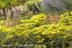 Small, whorled linear leaves, bathed in tranquil bluish celadon hues, are pointed and narrow, yet slightly broader and not as closely arranged as those of ‘Dean’s Hybrid’. A long lasting day glow display of bright lime-green flower heads and wine-infused older stems bring dramatic elements to the low tailored evergreen mound that needs minimal water and braves the deer. Grateful for a well-drained niche, ‘Limewall’s effulgent blooms enliven perennials such as Saponaria ‘Max Frei’ and Origanum libanoticum.