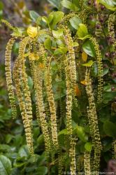 An unusual member of a small curious genus that venerates Georg Helwing, a German pastor and scholar on Prussian flora, this attractive multistemmed evergreen was collected during Dan Hinkley's 1996 expedition to China's Sichuan Province. Willow-shaped dark green foliage defined by a lustrous finish, maroon tinges and minutely toothed margins, alternately cloaks smooth green upright stems and generates unique flowers—tiny cream-colored spheres perched upon its midribs. Yielding a reputed remedy for skin inflammations, Helwingia chinensis bestows colorful year-round accents upon the woodland garden, where it relishes light shade, well-drained soil and regular moisture.