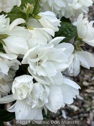 Discovered in 2008 and newly introduced, this spectacular native cultivar sprung up as a chance seedling in a Pipersville, PA garden. ‘Haas’ Halo’ premiers massive, 12 in. wide lace-caps with up to 50 good-sized sterile florets hoisted above an upright deciduous foundation, whose strong sturdy stems easily support the snowy-white extravaganza. Large, round, pointed leaves imparting bluish overtones compose a leathery green foil for the magnificent flowers that sustain a comely dried presence some 6 months after they’ve stopped blooming. Though the precise lineage remains uncertain, its stalwart demeanor is known to tackle heat, humidity and drought as well as enliven just about any planting bed. (PPAF)