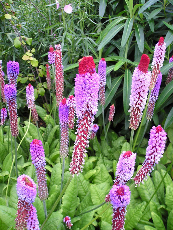 The pyramidal, Kniphofia-like flowers of this highly unusual Primula are bicolored, with purple at the base and reddish fuchsia at the apex. Perched on 15 in. stalks above oblong, blunt-tipped green basal foliage, the fanciful blooms provide perfumed accents either in large drifts or surrounded by Aruncus aethusifolius and Epimedium ‘Purple Pixie’.
