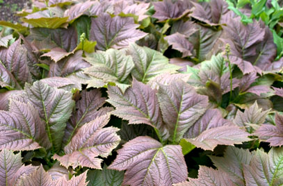Native to China and Japan, this spectacular genus will grow in ordinary garden soil, but give it a rich moist home along a pond, stream or marshy area and it will thrive. Rodgersias are fine structural specimens characterized by fleshy brownish black rhizomes, which remain visible through winter. The numerous unpetaled flowers, colored by intriguing creamy-salmon sepals and stamens, are borne on large panicles, and when in bud look almost like miniature cauliflowers. And, be warned! The textured, dark green leaves can spread to a foot across, so be sure to provide these plants with plenty of space.