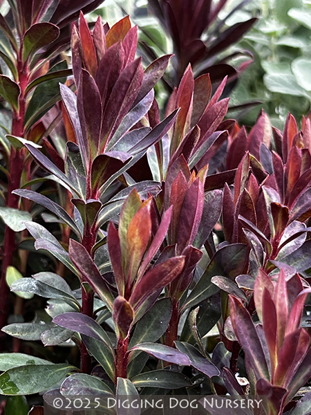 Chanced upon at Notcutts Nursery in England, this gold medal-winning ‘Redwing’ sport premiers plentiful lemon-lime colored flowers accompanied by a dramatic dose of red-imbued new growth and stems, plus elliptical dark burgundy and purple mature leaves. Tailored, well-branched and thickset, the bushy undemanding habit graces containers, mixed borders or rock gardens with velvet-like allure, while abiding deer and shallow rocky soil as well as periodic dry conditions. ‘Blackbird’ retains its evergreen good looks year round in warmer locales. (pp#17,178)